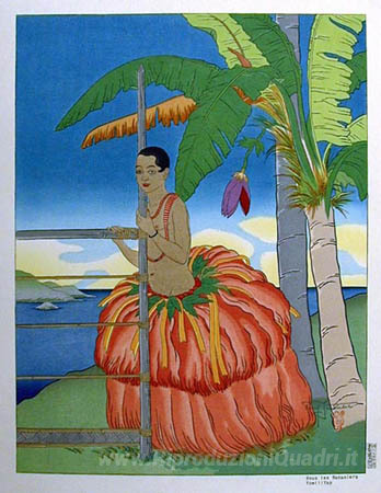 Ti offriamo una riproduzione artigianale su tela dell'opera famosa 'Sous Les Bananiers. Tomil, Yap' di Paul Jacoulet, dal Museo delle Riproduzioni.
