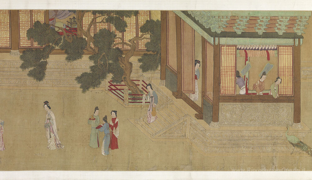 Ti offriamo una riproduzione artigianale su tela dell'opera famosa 'Spring Morning nel Palazzo Han (Visualizza C)' di Qiu Ying, dal Museo delle Riproduzioni.