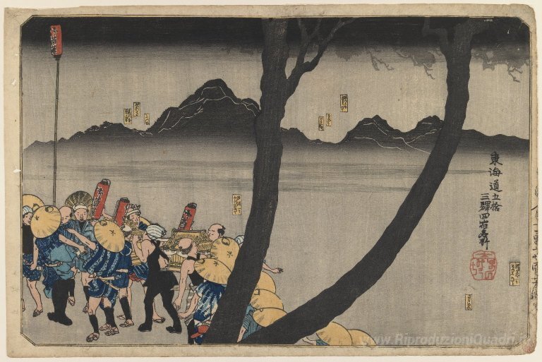 Ti offriamo una riproduzione artigianale su tela dell'opera famosa 'Stazione Hodogaya attraverso Hiratsuka' di Utagawa Kuniyoshi, dal Museo delle Riproduzioni.