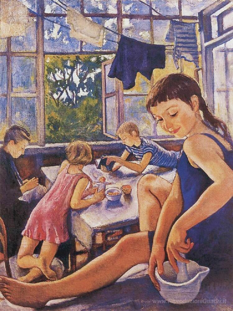 Ti offriamo una riproduzione artigianale su tela dell'opera famosa 'Sulla terrazza a Kharkov' di Zinaida Serebriakova, dal Museo delle Riproduzioni.