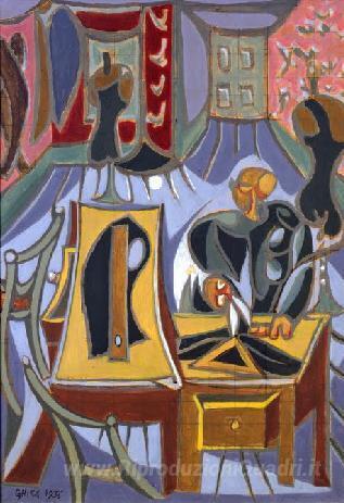 Ti offriamo una riproduzione artigianale su tela dell'opera famosa 'Tailor III' di Nikos Hadjikyriakos-Ghikas, dal Museo delle Riproduzioni.
