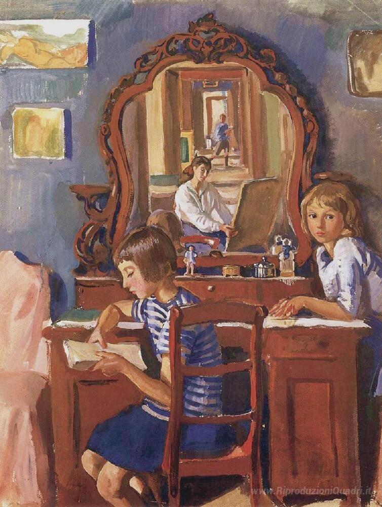 Ti offriamo una riproduzione artigianale su tela dell'opera famosa 'Tata e Katia nello specchio' di Zinaida Serebriakova, dal Museo delle Riproduzioni.