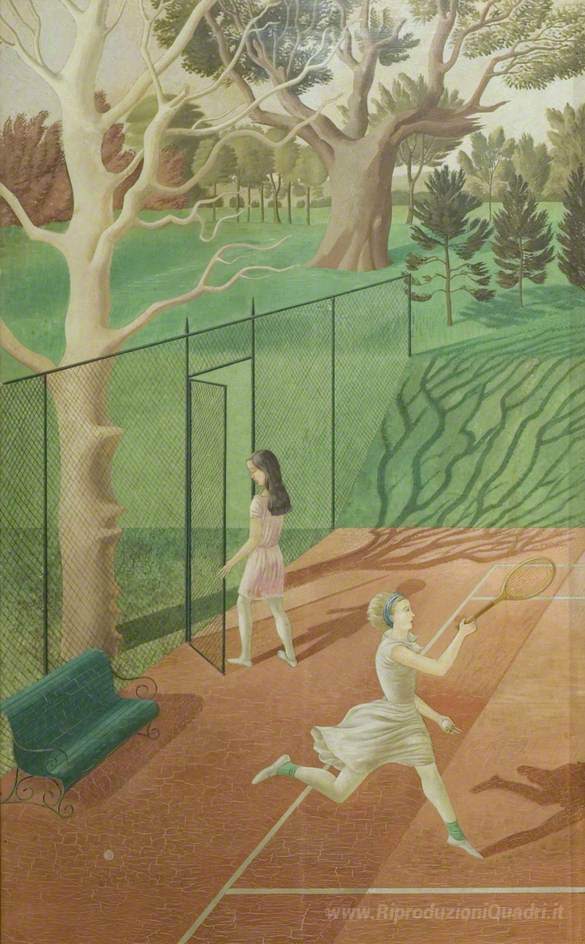 Ti offriamo una riproduzione artigianale su tela dell'opera famosa 'Tennis (trittico, di sinistra)' di Eric Ravilious, dal Museo delle Riproduzioni.