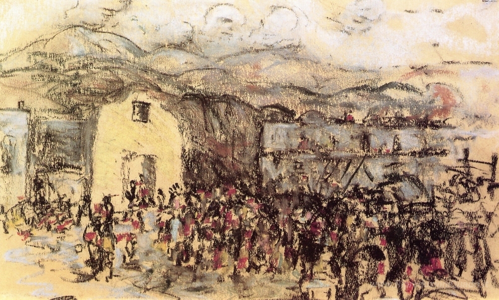 Ti offriamo una riproduzione artigianale su tela dell'opera famosa 'Tesuque Pueblo' di Robert Henri, dal Museo delle Riproduzioni.