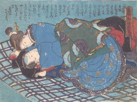 Ti offriamo una riproduzione artigianale su tela dell'opera famosa 'The Blue Futon' di Utagawa Kunisada, dal Museo delle Riproduzioni.