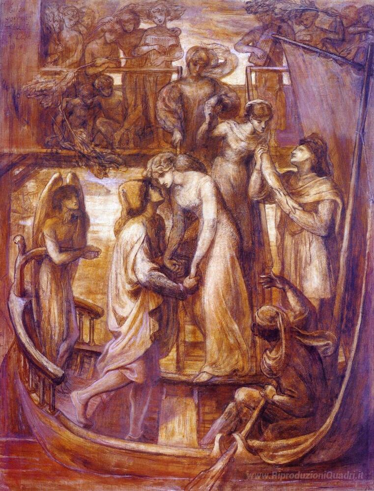 Ti offriamo una riproduzione artigianale su tela dell'opera famosa 'The Boat of Love' di Dante Gabriel Rossetti, dal Museo delle Riproduzioni.