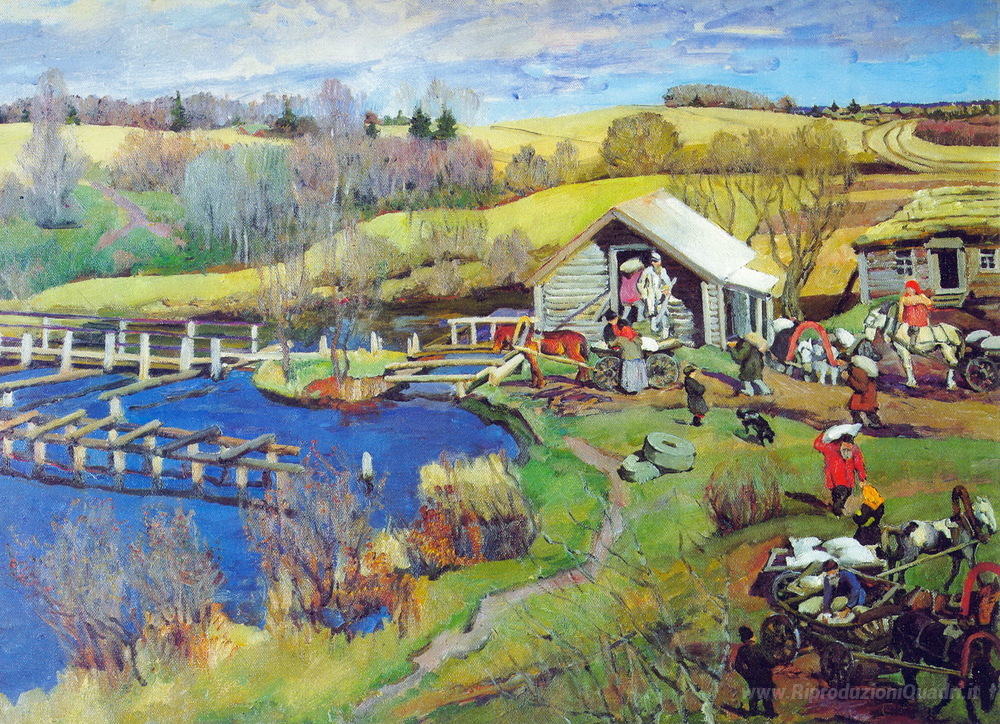 Ti offriamo una riproduzione artigianale su tela dell'opera famosa 'The Mill. Ottobre. Ligachevo' di Konstantin Yuon, dal Museo delle Riproduzioni.