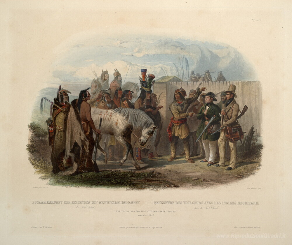 Ti offriamo una riproduzione artigianale su tela dell'opera famosa 'The Travellers Incontro con Minatarre indiani vicino a Fort Clar' di Karl Bodmer, dal Museo delle Riproduzioni.