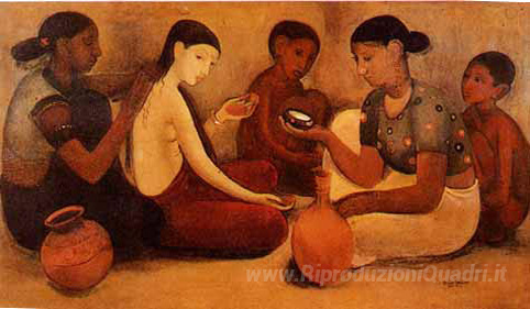 Ti offriamo una riproduzione artigianale su tela dell'opera famosa 'Toilette della sposa' di Amrita Sher-Gil, dal Museo delle Riproduzioni.
