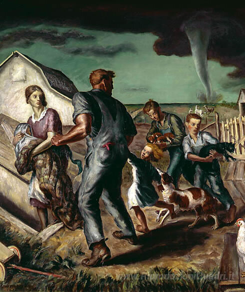 Ti offriamo una riproduzione artigianale su tela dell'opera famosa 'Tornado Oltre Kansas' di John Steuart Curry, dal Museo delle Riproduzioni.