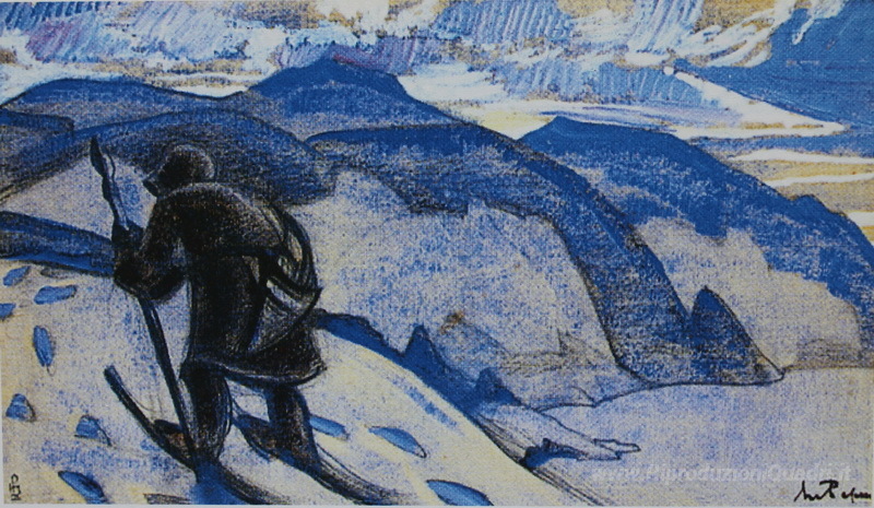 Ti offriamo una riproduzione artigianale su tela dell'opera famosa 'Tracce (Mountain Wanderer)' di Nicholas Roerich, dal Museo delle Riproduzioni.