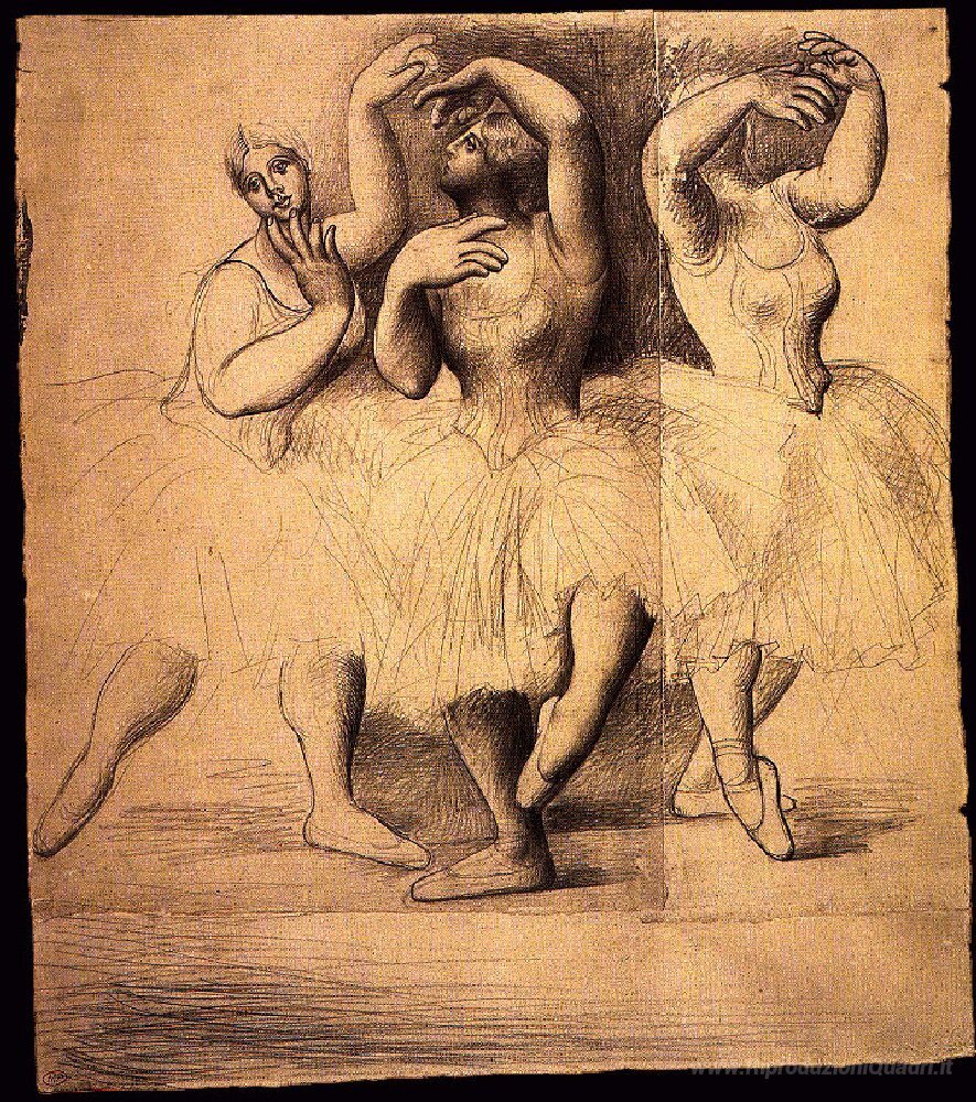 Ti offriamo una riproduzione artigianale su tela dell'opera famosa 'Tre danzatori' di Pablo Picasso, dal Museo delle Riproduzioni.