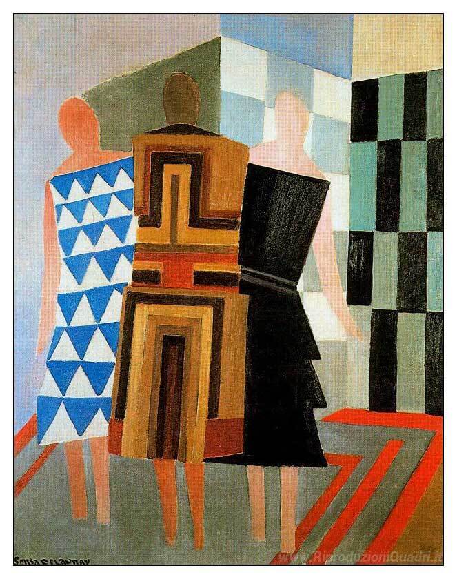 Ti offriamo una riproduzione artigianale su tela dell'opera famosa 'Tre Donne vestite contemporaneamente' di Sonia Delaunay, dal Museo delle Riproduzioni.