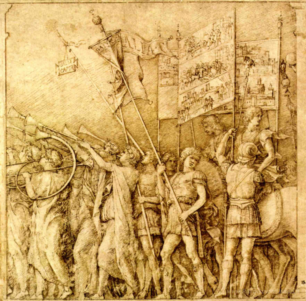 Ti offriamo una riproduzione artigianale su tela dell'opera famosa 'Trombettieri, portando bandiere e striscioni' di Andrea Mantegna, dal Museo delle Riproduzioni.