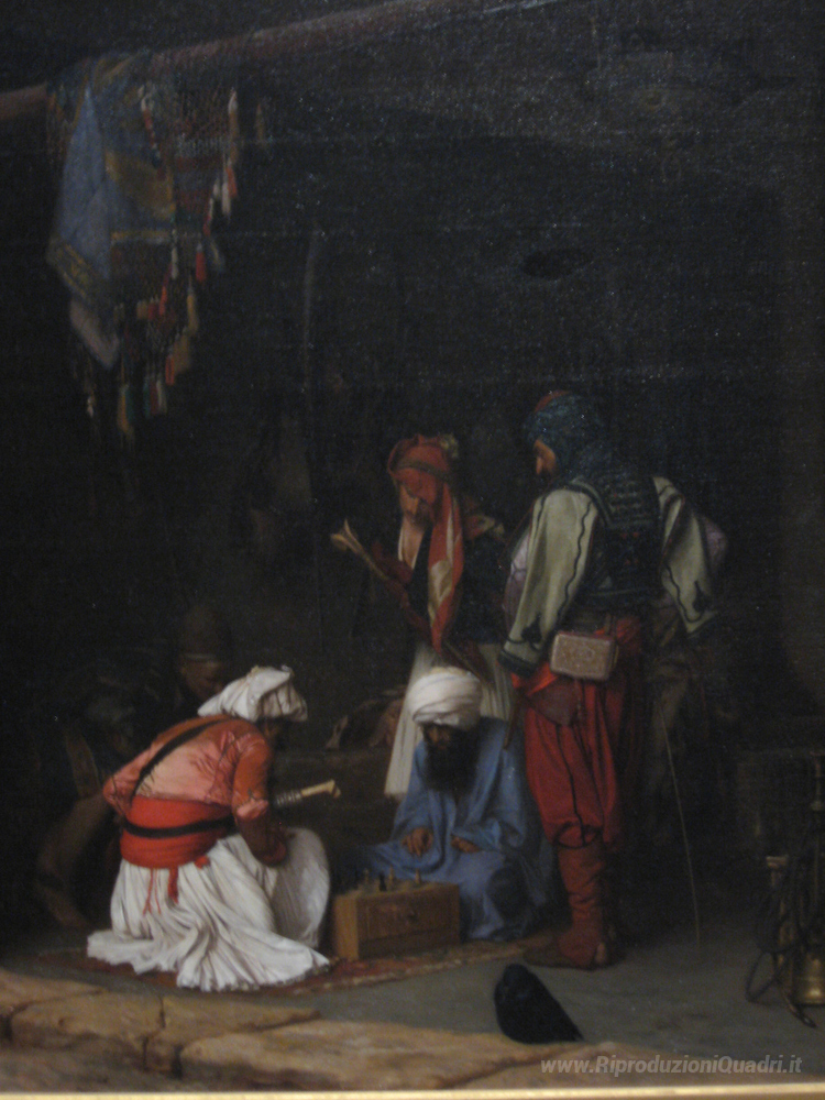 Ti offriamo una riproduzione artigianale su tela dell'opera famosa 'Turkish Bashi Bazouk Mercenari giocare a scacchi in un Market Pl' di Jean-Leon Gerome, dal Museo delle Riproduzioni.