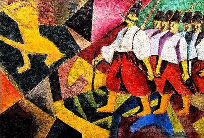 Ti offriamo una riproduzione artigianale su tela dell'opera famosa 'Ucraini' di David Burliuk, dal Museo delle Riproduzioni.