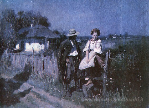 Ti offriamo una riproduzione artigianale su tela dell'opera famosa 'Un appuntamento' di Mykola Pymonenko, dal Museo delle Riproduzioni.