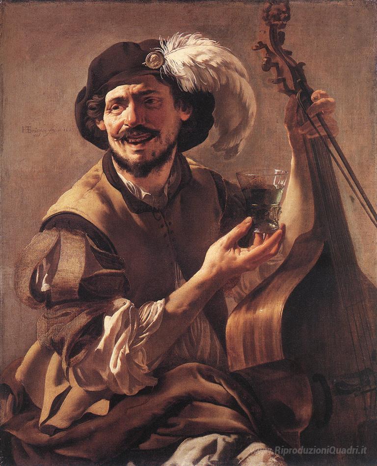 Ti offriamo una riproduzione artigianale su tela dell'opera famosa 'Un Bravo Ridere con un Bass Viol e un bicchiere' di Hendrick Terbrugghen, dal Museo delle Riproduzioni.