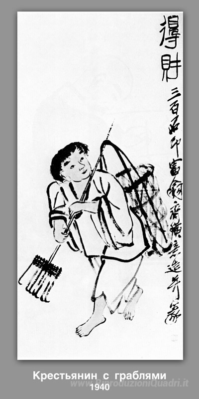 Ti offriamo una riproduzione artigianale su tela dell'opera famosa 'Un contadino con un rastrello' di Qi Baishi, dal Museo delle Riproduzioni.