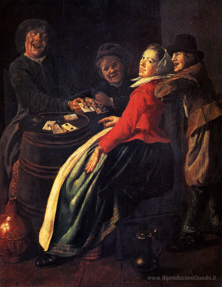 Ti offriamo una riproduzione artigianale su tela dell'opera famosa 'Un gioco di carte' di Judith Leyster, dal Museo delle Riproduzioni.