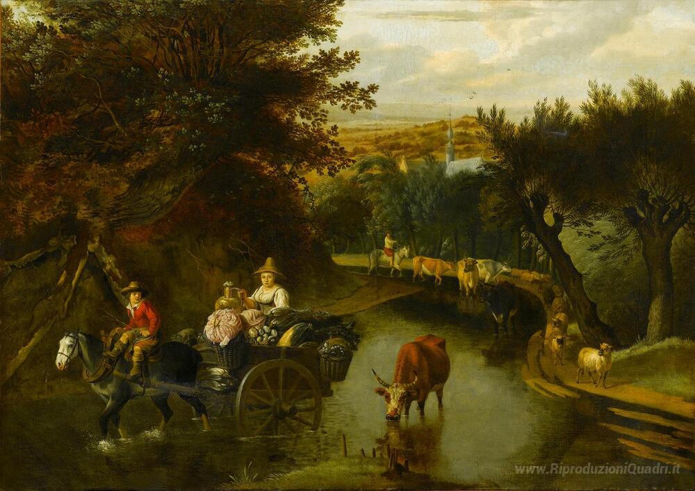 Ti offriamo una riproduzione artigianale su tela dell'opera famosa 'Un paesaggio boscoso con i contadini in un carro trainato da cav' di Jan Siberechts, dal Museo delle Riproduzioni.