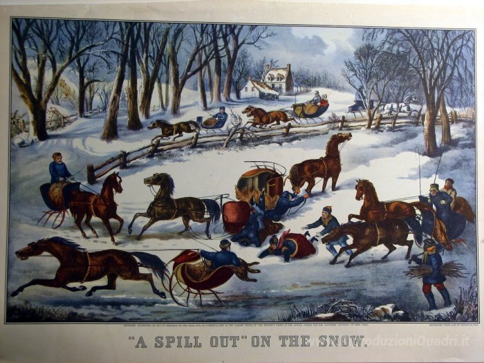 Ti offriamo una riproduzione artigianale su tela dell'opera famosa 'Un Spill Out 'sulla neve' di Currier and Ives, dal Museo delle Riproduzioni.