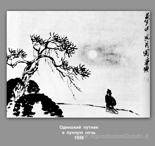Ti offriamo una riproduzione artigianale su tela dell'opera famosa 'Un viaggiatore solitario su una notte di luna' di Qi Baishi, dal Museo delle Riproduzioni.