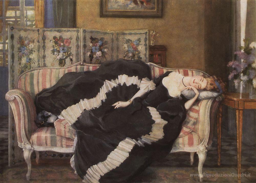 Ti offriamo una riproduzione artigianale su tela dell'opera famosa 'Una donna addormentata' di Konstantin Somov, dal Museo delle Riproduzioni.