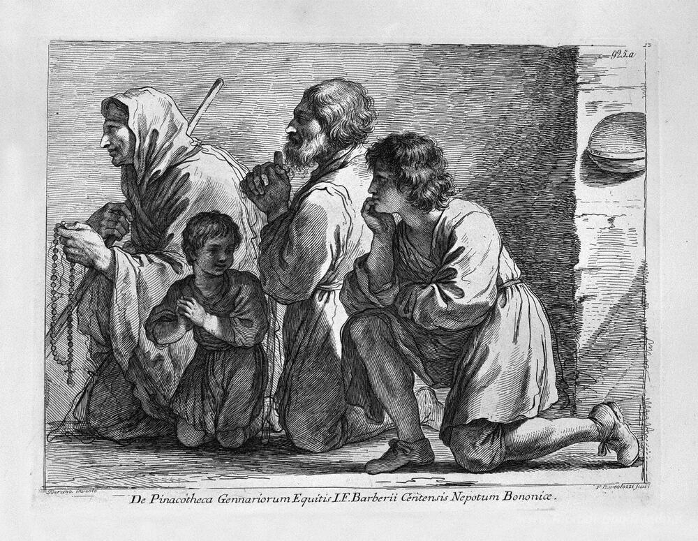 Ti offriamo una riproduzione artigianale su tela dell'opera famosa 'Una famiglia in preghiera' di Giovanni Battista Piranesi, dal Museo delle Riproduzioni.