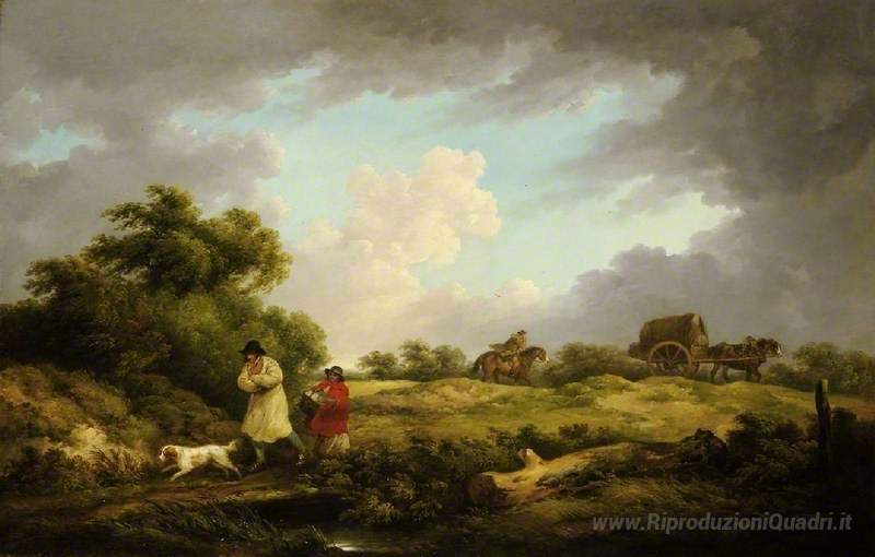 Ti offriamo una riproduzione artigianale su tela dell'opera famosa 'Una giornata ventosa' di George Morland, dal Museo delle Riproduzioni.