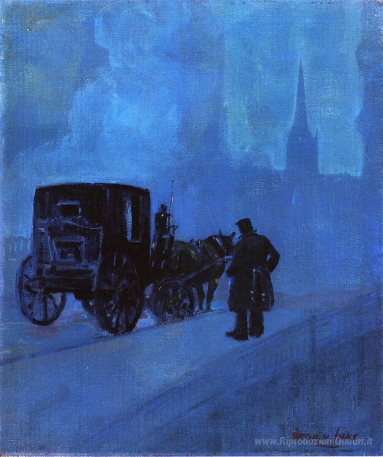 Ti offriamo una riproduzione artigianale su tela dell'opera famosa 'Una notte nebbiosa' di George Luks, dal Museo delle Riproduzioni.