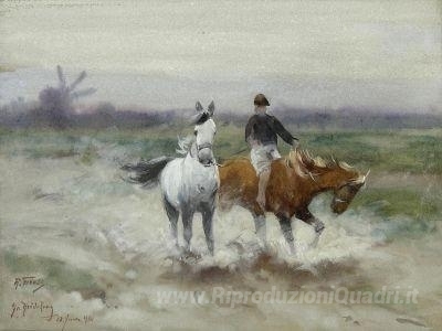 Ti offriamo una riproduzione artigianale su tela dell'opera famosa 'Una passeggiata a cavallo' di Richard Friese, dal Museo delle Riproduzioni.