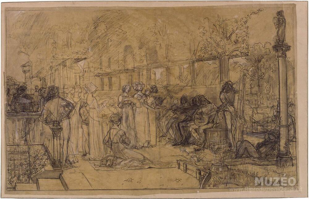 Ti offriamo una riproduzione artigianale su tela dell'opera famosa 'Uomini e donne che cantano e suonano musica' di Luc-Olivier Merson, dal Museo delle Riproduzioni.