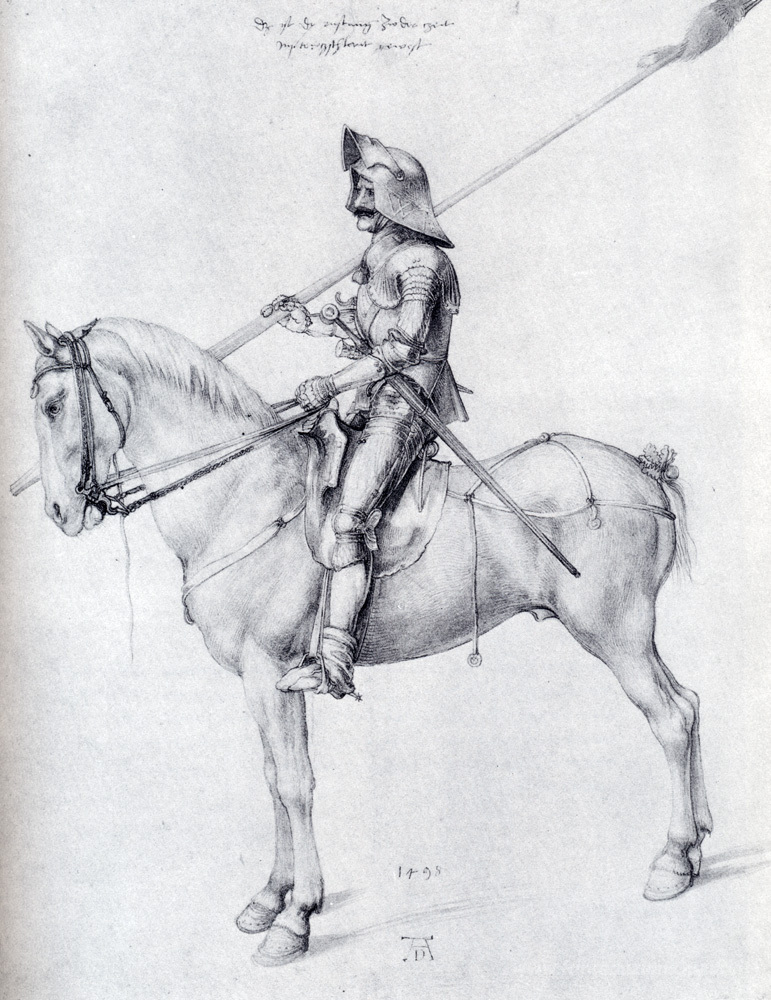 Ti offriamo una riproduzione artigianale su tela dell'opera famosa 'Uomo in armatura A cavallo' di Albrecht Durer, dal Museo delle Riproduzioni.