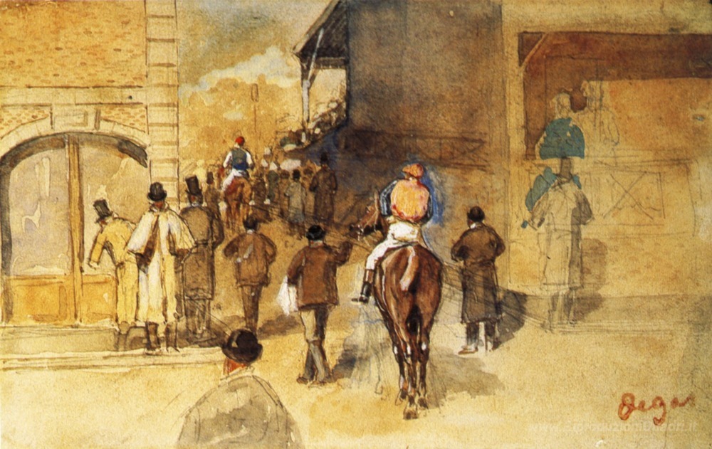 Ti offriamo una riproduzione artigianale su tela dell'opera famosa 'Uscita dalla pesatura' di Edgar Degas, dal Museo delle Riproduzioni.