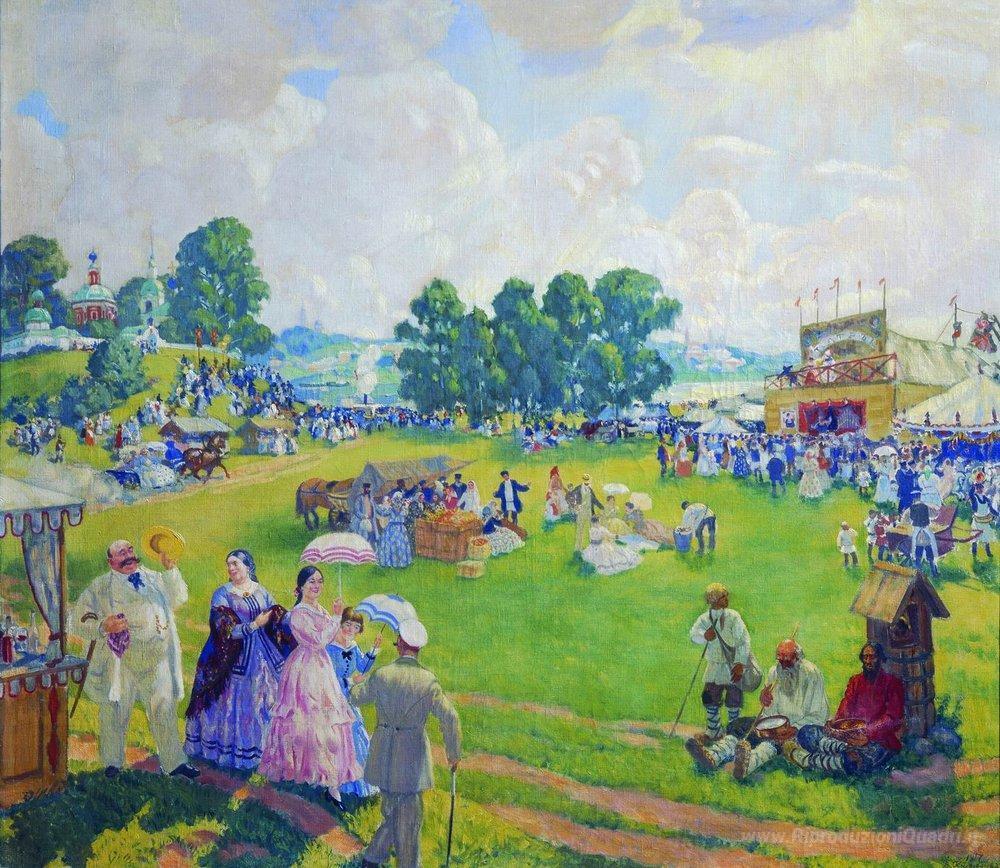 Ti offriamo una riproduzione artigianale su tela dell'opera famosa 'Vacanza in campagna' di Boris Kustodiev, dal Museo delle Riproduzioni.