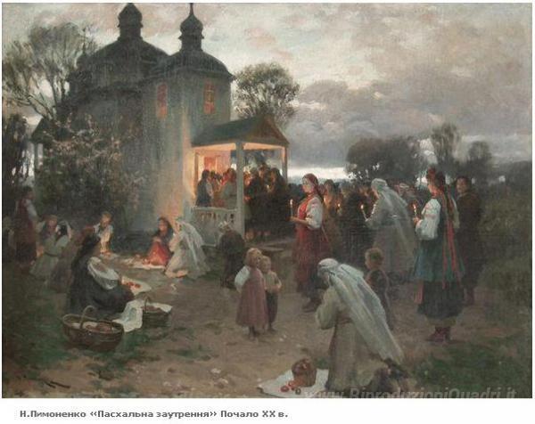 Ti offriamo una riproduzione artigianale su tela dell'opera famosa 'Veglia di Pasqua' di Mykola Pymonenko, dal Museo delle Riproduzioni.