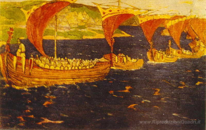 Ti offriamo una riproduzione artigianale su tela dell'opera famosa 'Vele Scarlet (ospiti d'oltremare)' di Nicholas Roerich, dal Museo delle Riproduzioni.