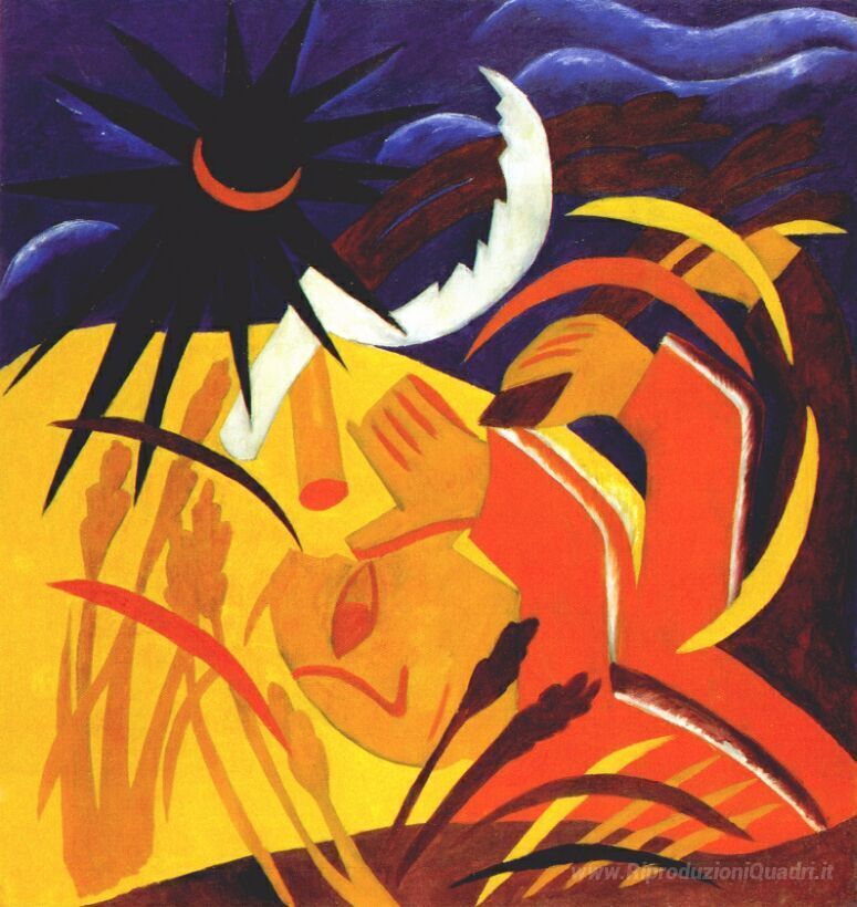 Ti offriamo una riproduzione artigianale su tela dell'opera famosa 'Vendemmia' di Natalia Goncharova, dal Museo delle Riproduzioni.