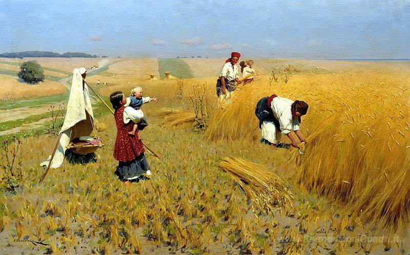 Ti offriamo una riproduzione artigianale su tela dell'opera famosa 'Vendemmia Raccolta in Ucraina' di Mykola Pymonenko, dal Museo delle Riproduzioni.