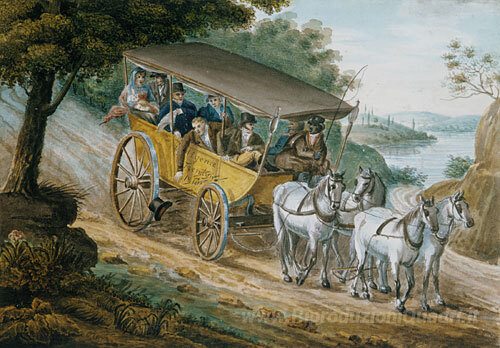 Ti offriamo una riproduzione artigianale su tela dell'opera famosa 'Viaggio in Stagecoach Vicino Trenton' di Pavel Svinyin, dal Museo delle Riproduzioni.
