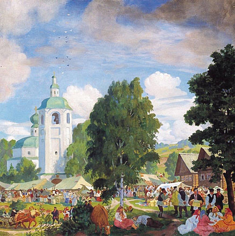 Ti offriamo una riproduzione artigianale su tela dell'opera famosa 'Village Fiera' di Boris Kustodiev, dal Museo delle Riproduzioni.