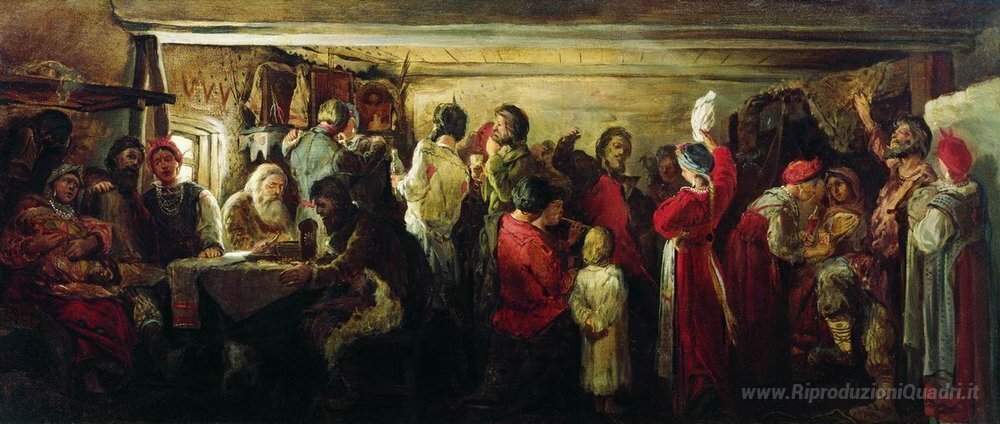 Ti offriamo una riproduzione artigianale su tela dell'opera famosa 'Villaggio di nozze nella provincia di Tambov' di Andrei Ryabushkin, dal Museo delle Riproduzioni.