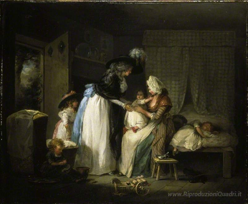 Ti offriamo una riproduzione artigianale su tela dell'opera famosa 'Visita al Bambino di Nurse' di George Morland, dal Museo delle Riproduzioni.