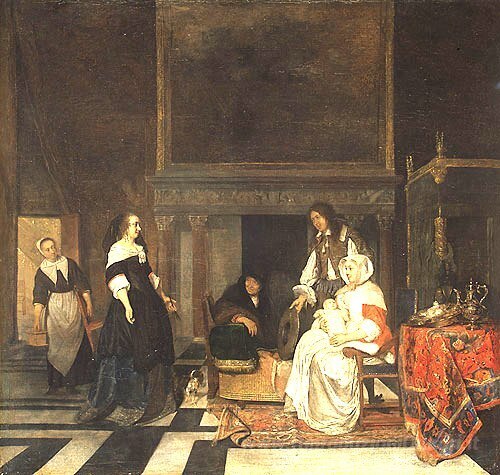 Ti offriamo una riproduzione artigianale su tela dell'opera famosa 'Visita al vivaio, dopo la nascita di Sara Hinlopen' di Gabriel Metsu, dal Museo delle Riproduzioni.