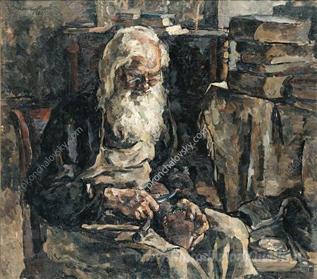Ti offriamo una riproduzione artigianale su tela dell'opera famosa 'Vissarion un calzolaio al lavoro' di Pyotr Konchalovsky, dal Museo delle Riproduzioni.