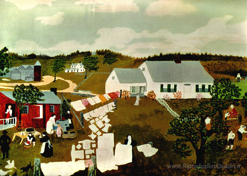 Ti offriamo una riproduzione artigianale su tela dell'opera famosa 'Wash Day' di Grandma Moses, dal Museo delle Riproduzioni.