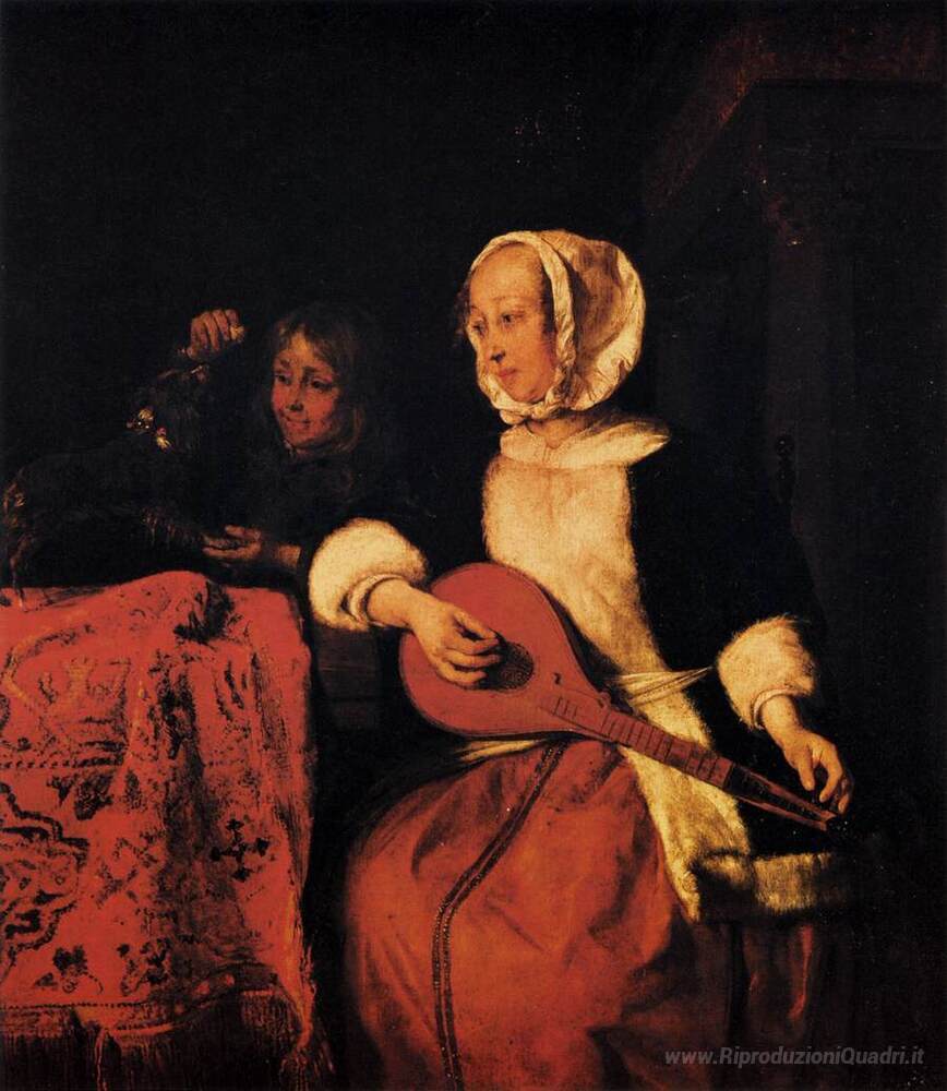 Ti offriamo una riproduzione artigianale su tela dell'opera famosa 'Woman Playing un mandolino' di Gabriel Metsu, dal Museo delle Riproduzioni.