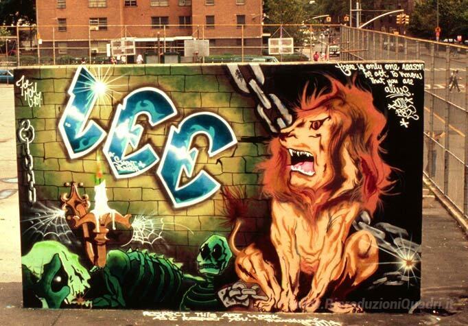 Ti offriamo una riproduzione artigianale su tela dell'opera famosa 'Den del Leone' di Lee Quinones, dal Museo delle Riproduzioni.