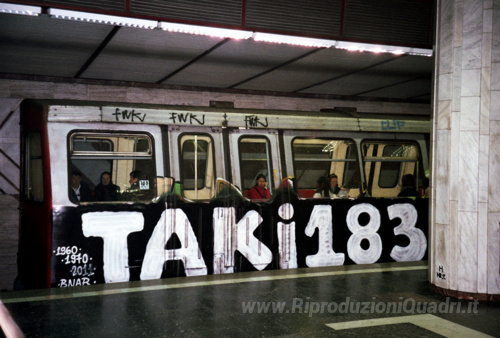 Ti offriamo una riproduzione artigianale su tela dell'opera famosa 'Metro Tag' di TAKI 183, dal Museo delle Riproduzioni.